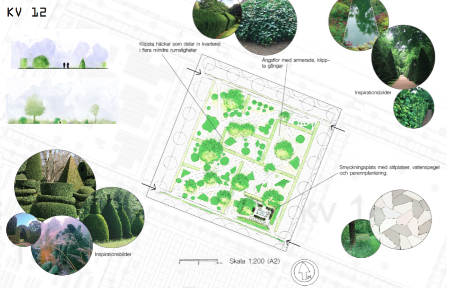 ex. gestaltningshandlingar såsom illustrationsplan, skisser över vyer och perspektiv, konstruktionsskisser. Övriga handlingar: planteringsplan, materialförteckning, växtförteckning samt skötselplan.